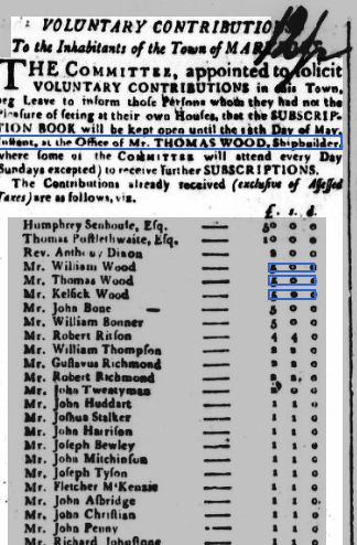 1776, Kirkham - On Nov 20 "a fine new vessel called the Kirkham, built by Mr William Wood, for Captain John Bone, was launched at Mary-Port: The launch was performed with the greatest nicety; and, as the length the vessel had to run was pretty considerable, it afforded an agreeable prospect to great number of spectators." - From THE CUMBERLAND CHRONICLE OR WHITEHAVEN INTELLIGENCER. Vol 1 No 1, Tuesday 5 Nov 1776.