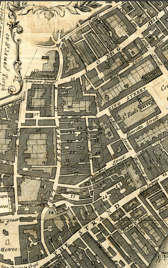 A useful plan which shows the individual houses in Cranbourne Street, Great Newport St, the North West Corner of St Martin's Lane (74 - 78), the North side of St Martin's Court and the three individual houses in Little Court the homes of John Gwynn (d.1786) and Samuel Wale behind the house of James Paine -